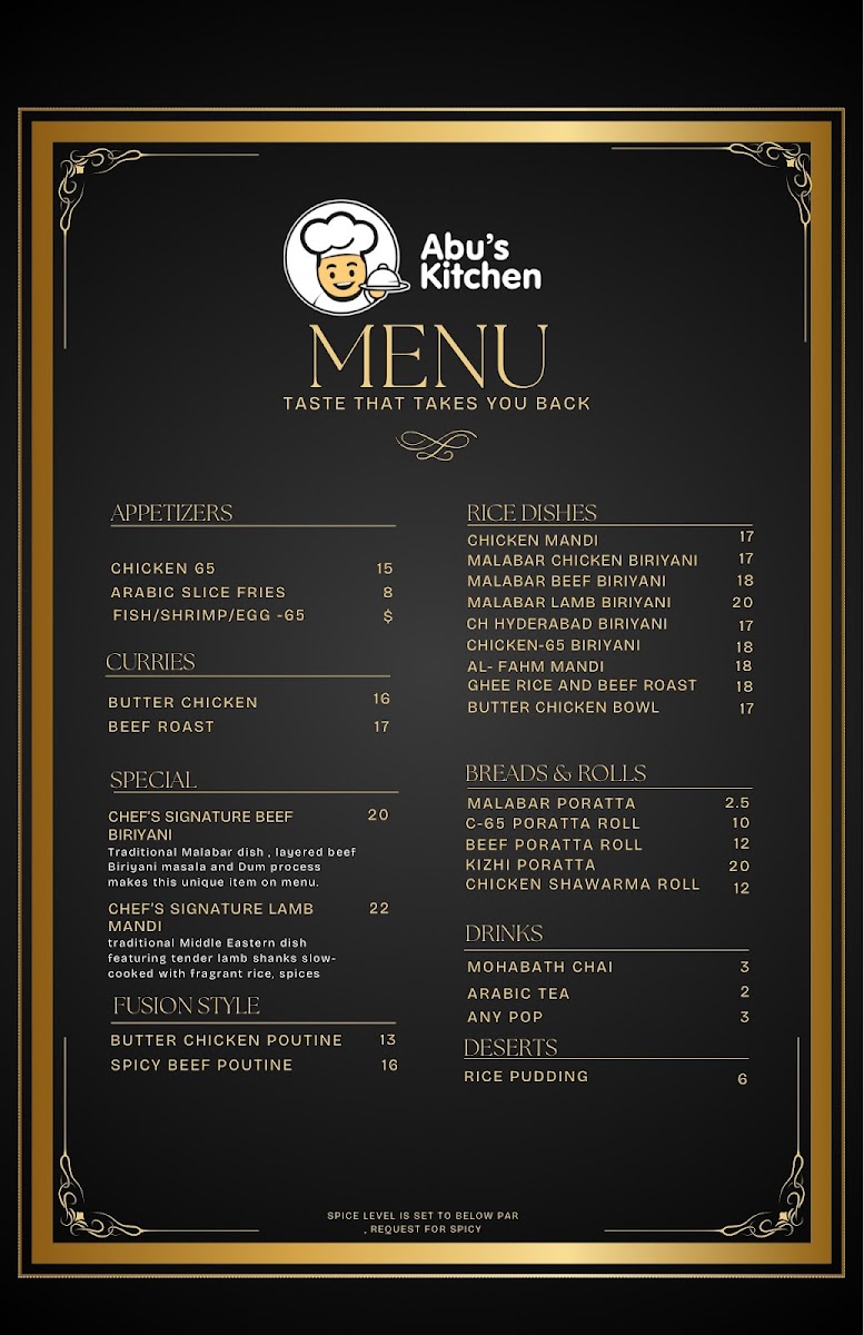 Abu's Kitchen offers a diverse menu with a delightful blend of Indian and Arabic flavors. For those craving the rich and aromatic spices of India, the Chicken Dum Biriyani - Malabar style and Beef Dum Biriyani - Malabar Style are standout dishes, both offering a mouthwatering mix of tender meat and fragrant rice, cooked to perfection. The Mutton Dum Biryani - Malabar Style is another excellent choice for biryani lovers, with the succulent mutton adding an extra layer of depth to the dish. If you're in the mood for something crispy, Chicken 65-Boneless is a popular option, with a bold, spicy flavor that leaves you craving more. For an even heartier meal, try Chicken 65 with Fries/Poratta, combining the deliciously spiced chicken with crispy fries or a soft, flaky paratha.